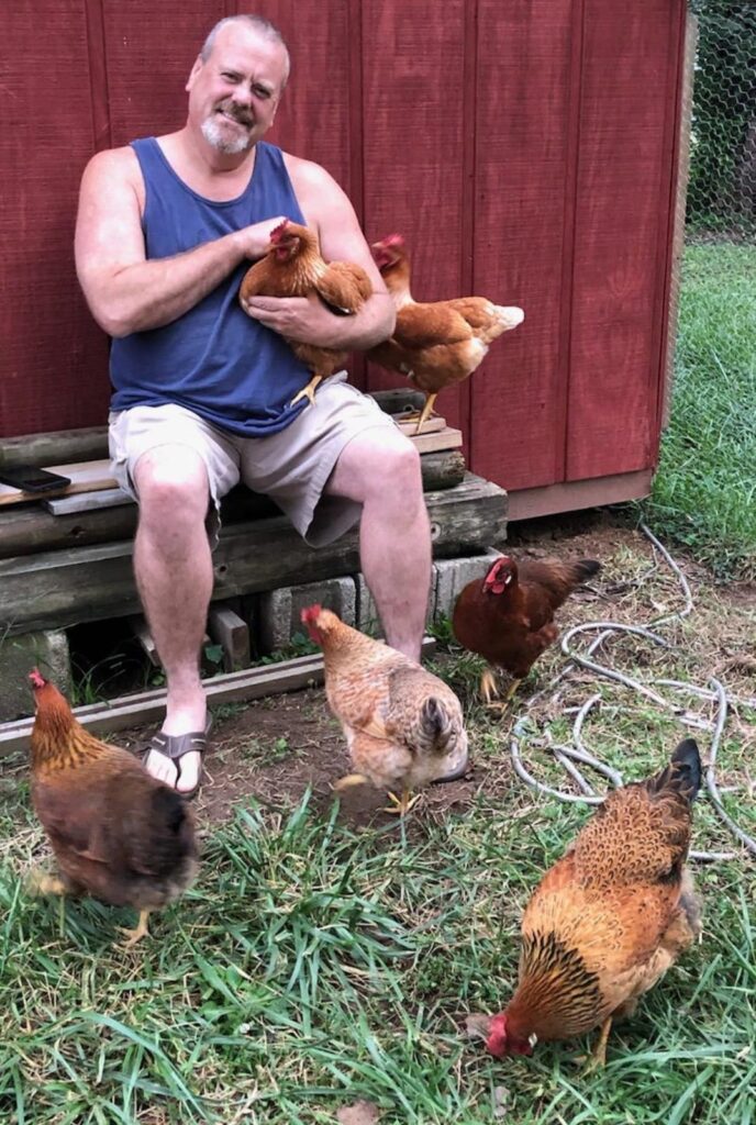 Brent Jackson accepts life as it comes. Never fears the unknown or things he has never tried. He leaves the worrying part to God. He is a hard worker and believes in a purpose driven life. He reveres the challenges and failures in life as simply a part of the big picture. No job is too grand or too menial for him. In the picture to the leftmost is Brent’s hand after spending hours in the garden pulling weeds. The picture on the right is Jackson taking a break and giving some live to his chickens.