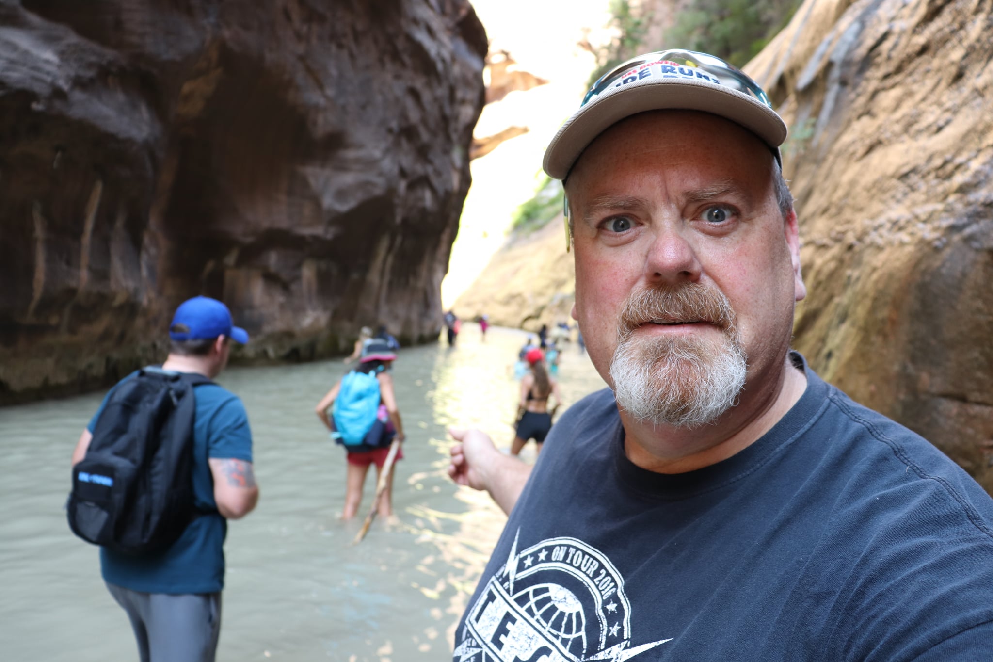 Brent Jackson likes to travel, explore new places, and meet new people. The picture on the left is a selfie at the Grand Canyon along the northern rim along a hike on the Albright Pass. The picture on the right was taken during a hike up the “Narrows”, the path of the Virgin River that runs through the canyons of the Zion National Park in Utah.