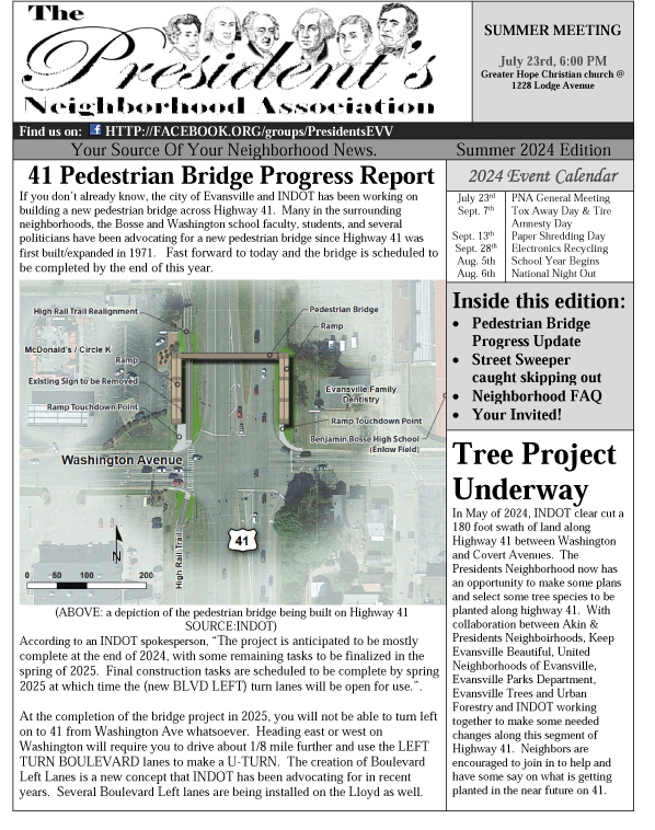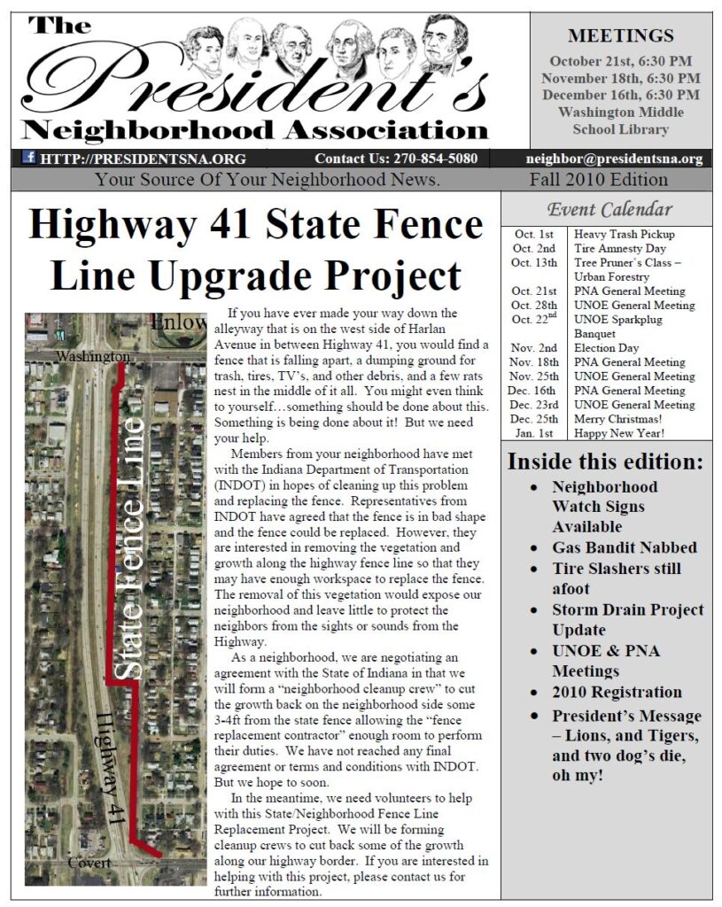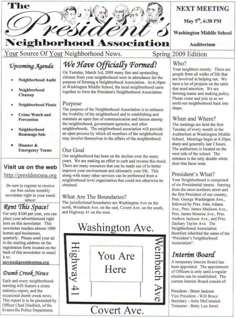 To the right is the Presidents Neighborhood’s first newsletter that Jackson developed. The Presidents NA logo and different variations of it was developed and gifted to the neighborhood by Jackson.